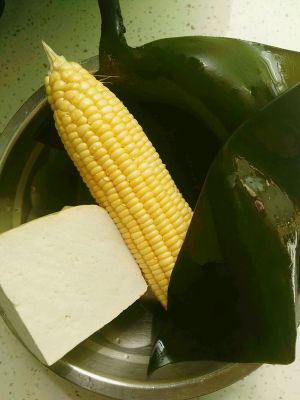 准备食材,豆腐切片,海带切菱形块,玉米切断。