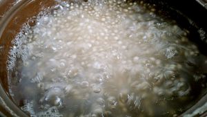 首先得有西米…把它稍微洗洗,水开了扔下去煮,煮到酱婶的,关火焖个十分钟,冷水冲洗下,再开水下锅,煮到还剩一点点儿白关火盖盖子焖到透明再冲洗一下就好啦