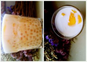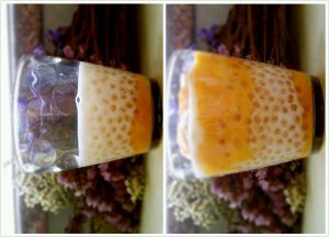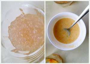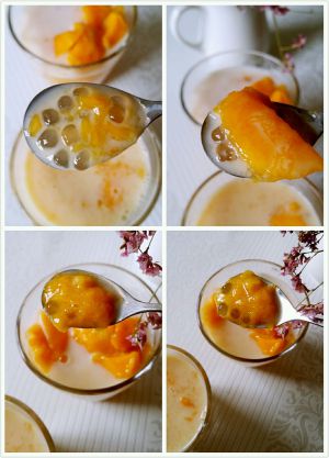 另一种是先把剩下的西米放杯子里,再把剩下的芒果泥和差不多份量的椰汁倒一块儿搅一搅倒进去,最上面再倒层椰汁,扔几个芒果块,就好啦