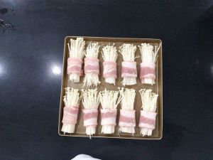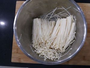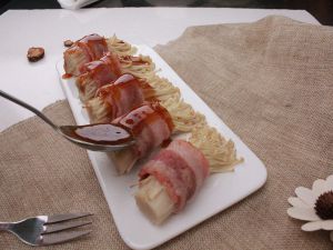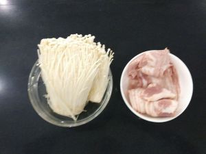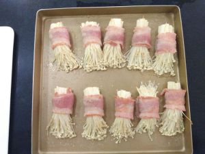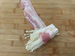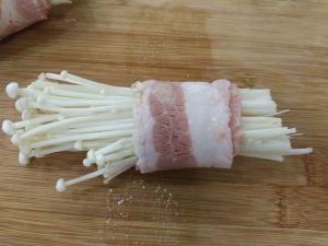 先拿一块培根平摊,再拿一部分金针菇放在培根上卷起。