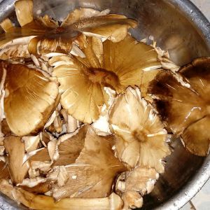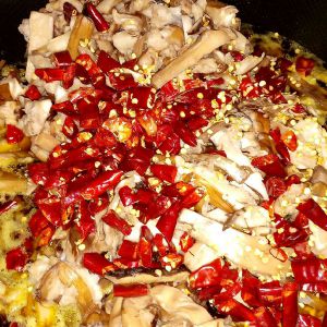 依次放入鸡枞、干辣椒节、花椒粒、八角粒、茴香籽
