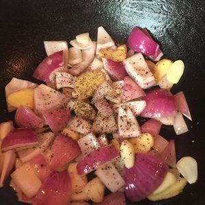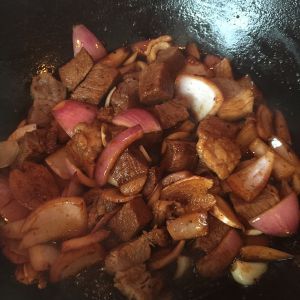 先炒洋葱然后放入蒜片姜片黑胡椒碎