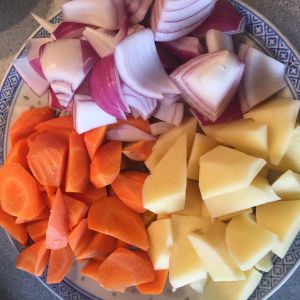 一个洋葱、一根胡萝卜、一个土豆切块备用