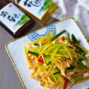 准备材料。莴笋去皮切丝。豆腐皮切丝。