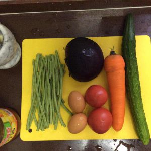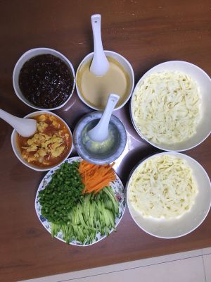 豆角热水焯一下切丁、胡萝卜切丝、黄瓜切丝、茄子切丁备用、西红柿切丁备用