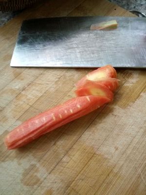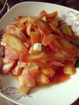 下锅翻炒3分钟,加一点水,把大葱放进去,最后加盐和鸡精