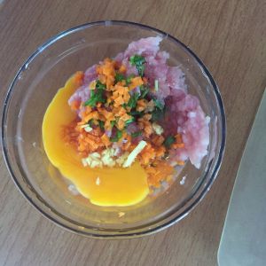 肉剁碎成肉末,拌入鸡蛋液、生姜碎、胡萝卜碎、葱末搅拌,加入香油、盐