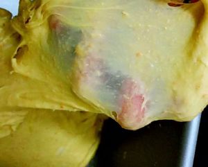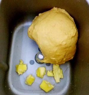 除黄油外的所有食材放入面包桶启动和面程序,揉成光滑的面团后加入软化的黄油。