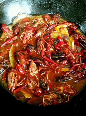 把小龙虾倒入翻炒,待小龙虾表皮变红把啤酒倒入,如果觉得一罐啤酒不够就加点开水,大火煮沸后转小火慢炖,待锅内汤汁变少就可以起锅了