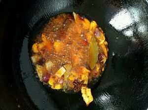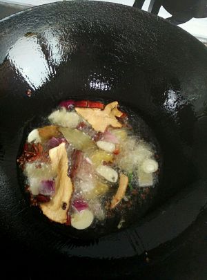 锅内放油,油要多放一些,油七分热时把香料放到油内炸香