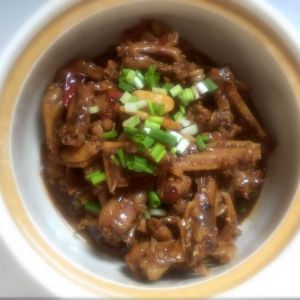 锅烧热,倒入少许油爆香大蒜,然后倒入压好的鸭掌与汤汁。ps:汤汁不要全倒,倒一半就好。然后烹入香醋!刚开始可能觉得不够辣,但是不要再加辣椒了,因为会越煮越辣越煮越辣