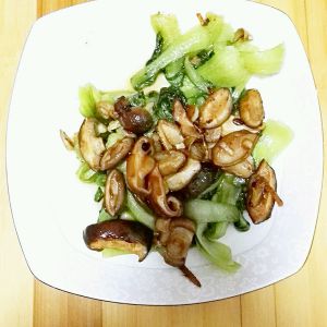 再热油适量,放入另一半葱姜丝爆香,倒入香菇,加酱油,盐,鸡精,加适量淀粉水,待汤汁收好,浇在之前的油菜上,出锅。