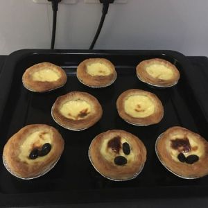 蛋挞液基本凝固之后可以在蛋挞上继续放入爱吃的蔓越莓干、红豆等。美美的等一小会儿,完成✅