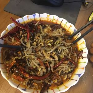 捞出肉 下豆芽 豆芽好后 盛碗 放蒜末 辣椒面