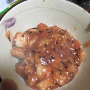 然后加炸好的里脊肉,撒黑白芝麻,出锅。