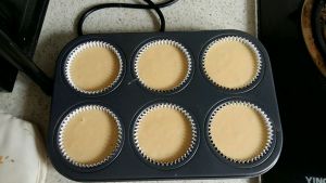6将搅拌好的蛋糕夜倒入六连蛋糕模具里,先把模具里放上纸杯,这样就容易脱模了!