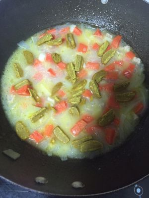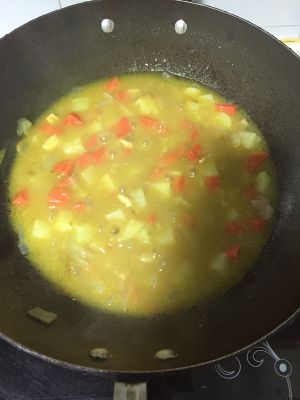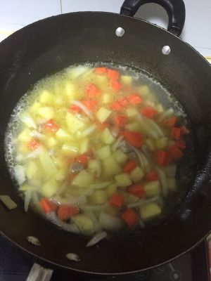 中火炖10分钟后,关火,把咖喱放入锅中,待完全融化后再开小火收汁,5分钟左右即可!