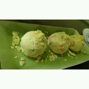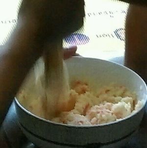 加入牛油果颗粒,搅拌均匀。戴一次性手套,捏成团,摆盘,表面撒上薯片碎即可。好吃得不得了