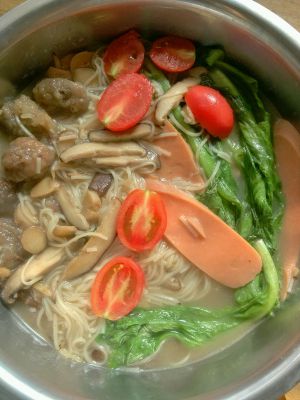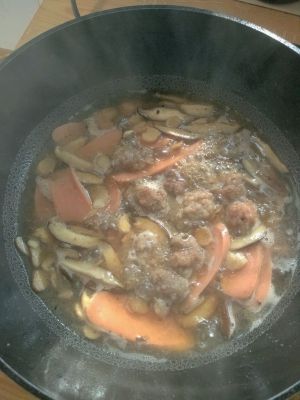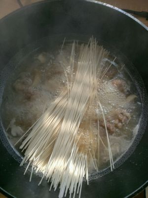 水沸放入面条(水沸后可以先把香菇和肉片捞出,不然面条煮开后会很稠,导致粘锅。牛肉丸子要留在锅中跟面条一起煮)