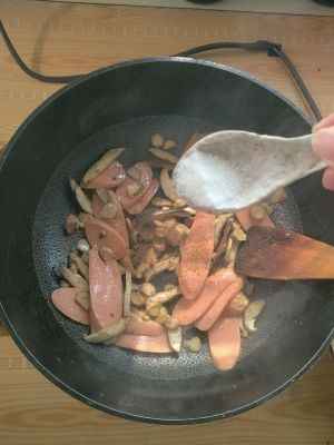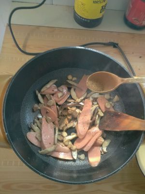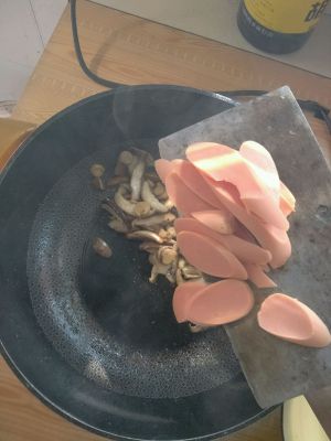 香菇炒至断生 出了香味 放入火腿肠(过培根片)继续翻炒几下