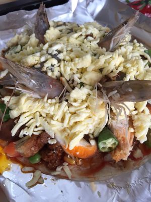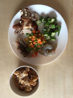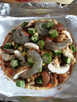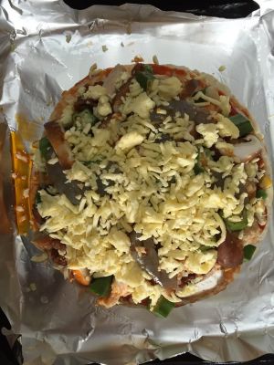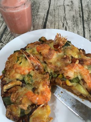 逐层码好,先涂一层番茄酱,摆田园杂菜(玉米胡萝卜青豌豆),牛肉末,鸡肉,香菇,秋葵,明虾,马苏里拉奶酪可以夹杂在其中几层,或懒人摆在最上一层。