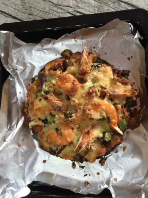 激动人心的时刻到了我来告诉你们下头怎么用…Yang望星空的虾披萨- -推入烤箱上下火200度,我的是熟食材,薄饼,烤了15分钟左右。