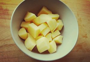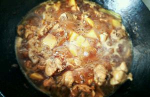 锅内剩油热,放入鸡腿块,煸炒后放入葱段,姜片,蒜子,花椒,料酒,老抽,冰糖,盐,继续翻炒,放入开水(抹过鸡块即可)。炖至七成熟放入土豆,将收汁时倒入小洋葱。
