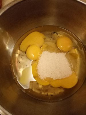 拿一只干净无油无水的碗,打入鸡蛋,再加入白糖