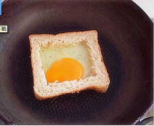 像这样先把土司中间切掉 锅里放适量油(就煎一个鸡蛋的量)小火烧五成热 放入土司 油七成热再打入鸡蛋