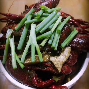 除了葱段以外,将其他材料大火爆香,然后放入龙虾煸炒。加入盐,料酒,生抽,大火翻炒两分钟后,小火焖煮10分钟左右,以便入味。