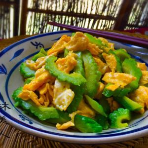 苦瓜切两头扔掉,用勺子刨籽扔掉,洗净切厚片,鸡蛋打散,如果是洋鸡蛋就3颗。