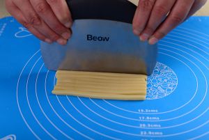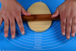 把松弛好的面团放在案板上檊成厚度约为0.5CM的长方形面团。檊的时候可以撒一些面粉在案板上防粘(其实不撒也不怎么粘的)