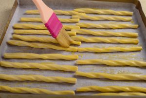 在做好的条儿上刷一层全蛋液,就可以进烤箱烘焙了。中层,180度,约25分钟。烤到表面金黄色即可