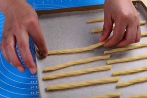 两手拿起一根长条的两端,扭几圈,再放到铺了锡纸的烤盘里(直接放到烤盘上亦可,烤盘不要涂油)