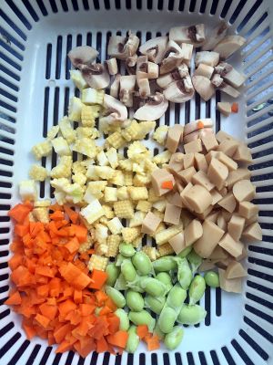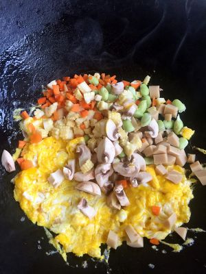 热锅凉油,先滑炒鸡蛋,再放入配菜炒熟。