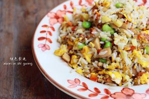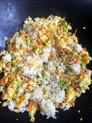 配菜熟后下入凉米饭,并不停翻炒均匀,至米饭呈散开干爽状,待香味出来后加盐调味。