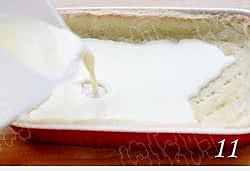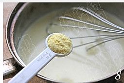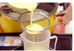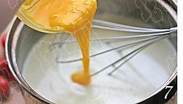 牛奶、淡奶油、糖搅匀后小火加热至刚刚沸腾时离火,趁热倒入打散的蛋黄,搅拌均匀;