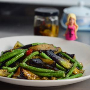 锅留底油,放蒜蓉豆豉煸香,加入豇豆、茄子、牛肝菌酱少许,糖、生抽,少许水翻炒到水收干