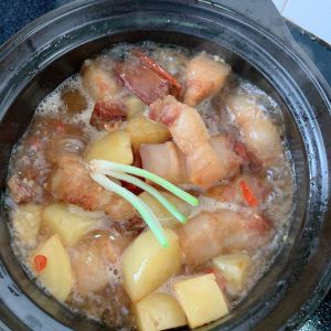 煮好后揭盖撒葱花,一道不那么油腻却好吃的土豆红烧肉就好啦!