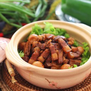 准备好材料,把煮熟的鹌鹑蛋去皮,豆腐泡切开,五花肉切成小块。