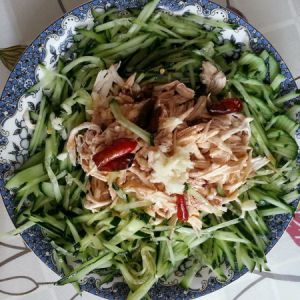 将黄瓜切丝备用,接下来将鸡肉块撕成鸡丝备用,接下来调汁(这个是我自己习惯调的汁跟饭店做的红油版的不太一样)