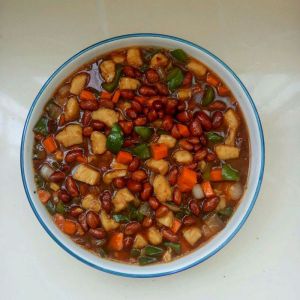 放入青椒丁,胡萝卜丁,洋葱丁翻炒。