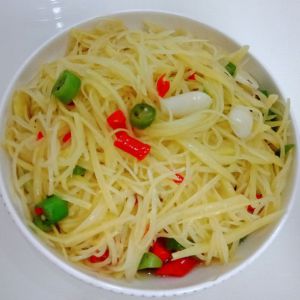 清水洗一遍,锅烧热倒油,放辣椒,大蒜炒香,然后倒入土豆丝翻炒,依次加入盐,少量白糖,白醋,炒熟即可,要是粘锅可以少量放水,土豆丝熟的快,不要炒过了,喜欢酸辣味重的可以多放点辣椒白醋
