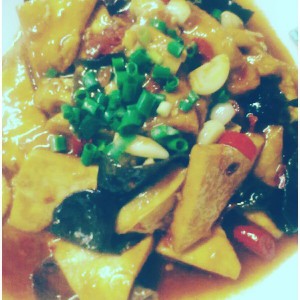 1.洗锅,滑锅,放少许油,加入拍好的大蒜,再加入木耳与瘦肉,炒香下,加入一勺豆瓣酱《攸县豆瓣》,少许辣妹子。加入一勺清水,淹过豆腐。