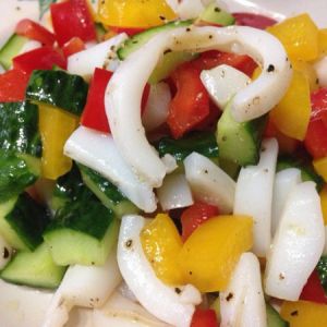 准备好材料 甜椒和黄瓜切丁 目鱼切成条状后热水下锅汆熟捞起(水中加少许姜和白酒去腥 目鱼不要汆过头太老不好吃)