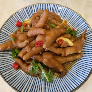 鸡爪处理干净以后,沥干水分放入一个大盆中,放入味极鲜酱油75克,生抽75克,香醋或者米醋150克,两勺白糖,柠檬切小片,小米椒,香菜,大蒜片,少许盐,香油一勺,搅拌均匀,包上保鲜膜放到冰箱冷藏室,一天就可以吃了。在冰箱泡了一天的鸡爪口感会变得很Q