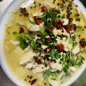 锅中煮开后,捞出鱼骨和酸菜,把腌制好的鱼片放入锅内,划散就不要搅拌了,鱼片变白熟了马上捞起,把汤也倒入盛鱼骨的盆中。再另起锅烧油放入花椒麻椒干辣椒️和蒜炒香,盖上香菜和葱花,热油一扑,就做好了。