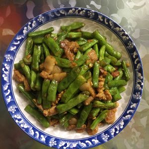 把四季豆焖熟后倒入刚炒好的猪肉,翻炒一下,再加入少许蚝油还有一点点大曲酒增香一下。再把它翻炒均匀盖上锅盖焖上一两分钟就了以出锅了。