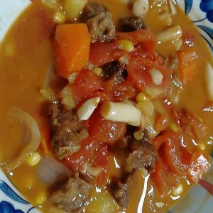 滚开五分钟后,下胡萝卜,玉米粒,蘑菇土豆。加盐,十三香,味精,冰糖,继续煮。