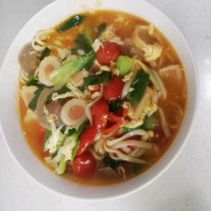 圣女果切小块,蒜苗切小段,青菜洗干净,鸡蛋打散,鱼丸切成小块(开始不准备放鱼丸,孩子要吃,临时加上),食材都准备好
